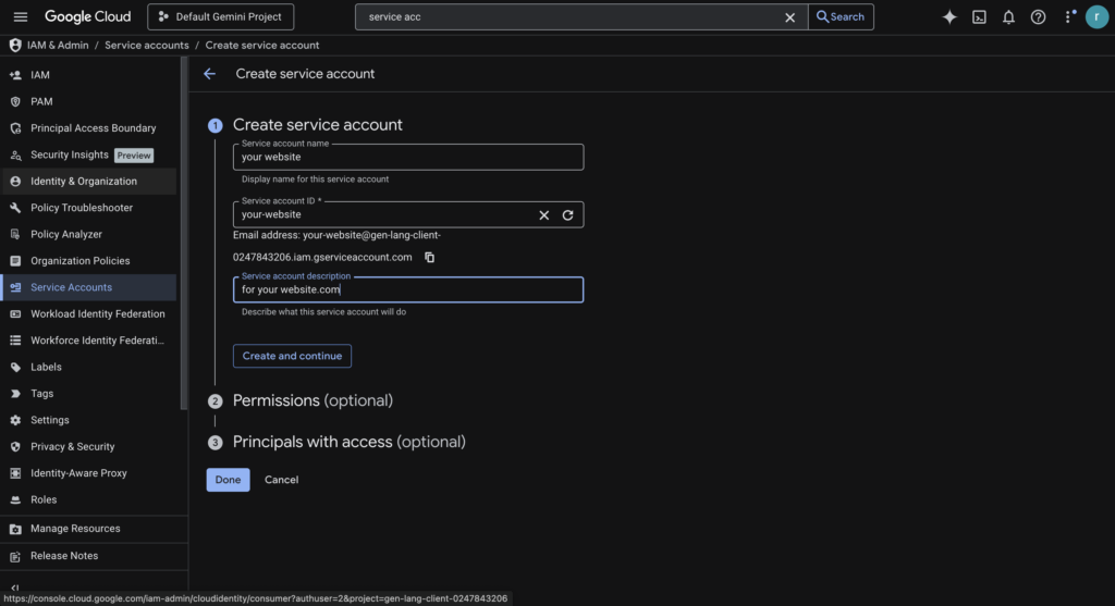 Grant this service account access to project: Bagian permission ini bisa Anda kosongkan atau langsung klik Continue.