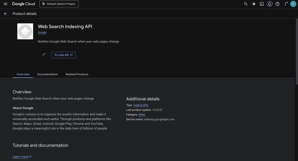 Kunci JSON tidak akan bekerja jika fiturnya belum diaktifkan. Buka link Google Cloud API Library – Indexing API. Pastikan Anda menggunakan akun email yang sama, lalu klik tombol Enable. Tanpa langkah ini, sistem akan memunculkan error “API not enabled”.