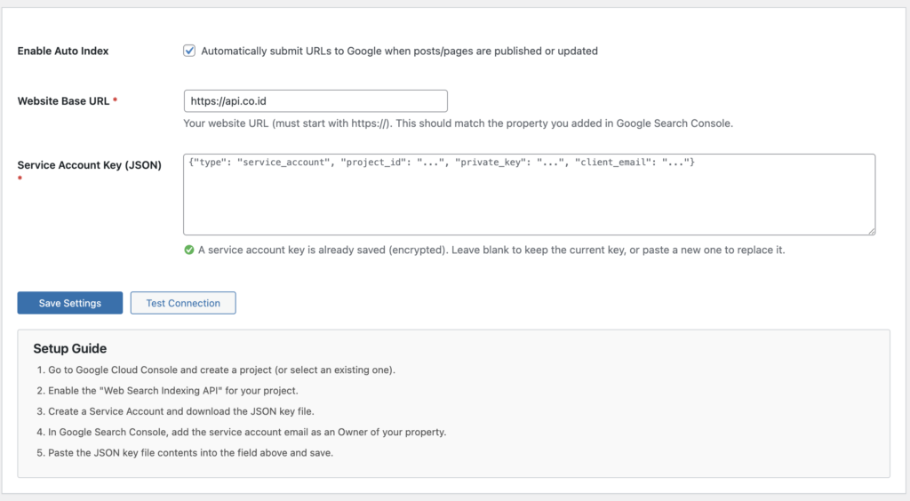 “Connection successful! Test URL (https://api.co.id/) was submitted to Google Indexing API.”