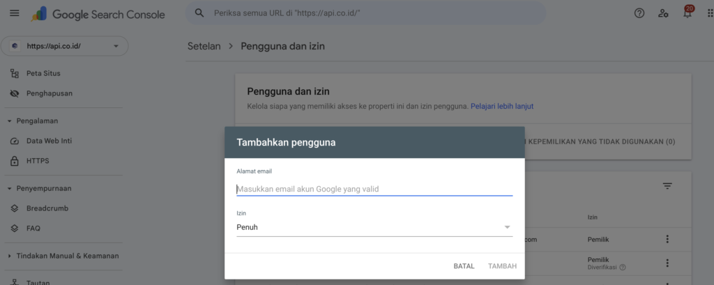 Ini adalah langkah paling krusial. Google harus tahu bahwa Service Account tersebut memiliki izin untuk mengelola domain Anda.